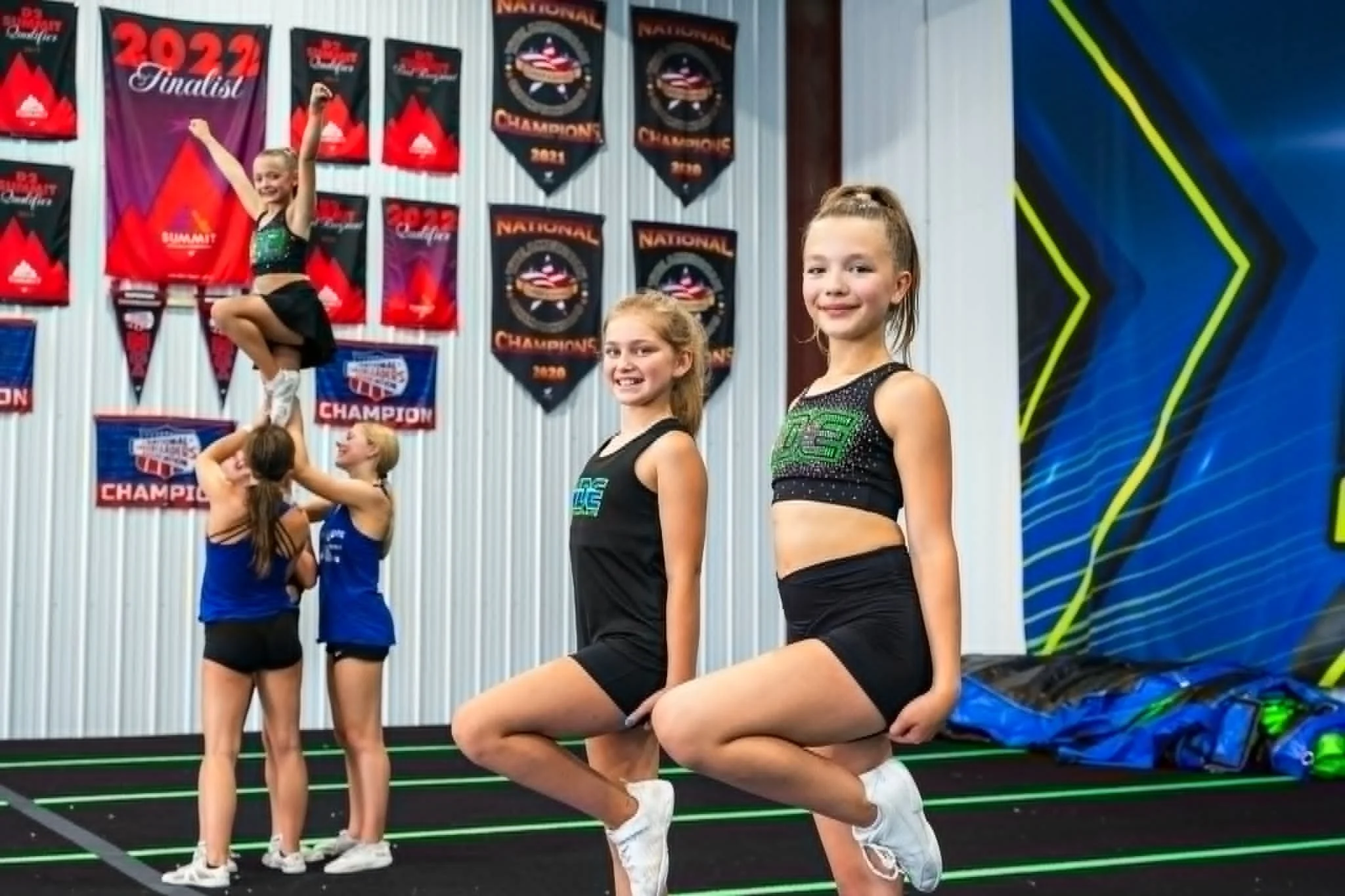 Cheerleaders practicing in a gym with banners and awards hanging on the wall.