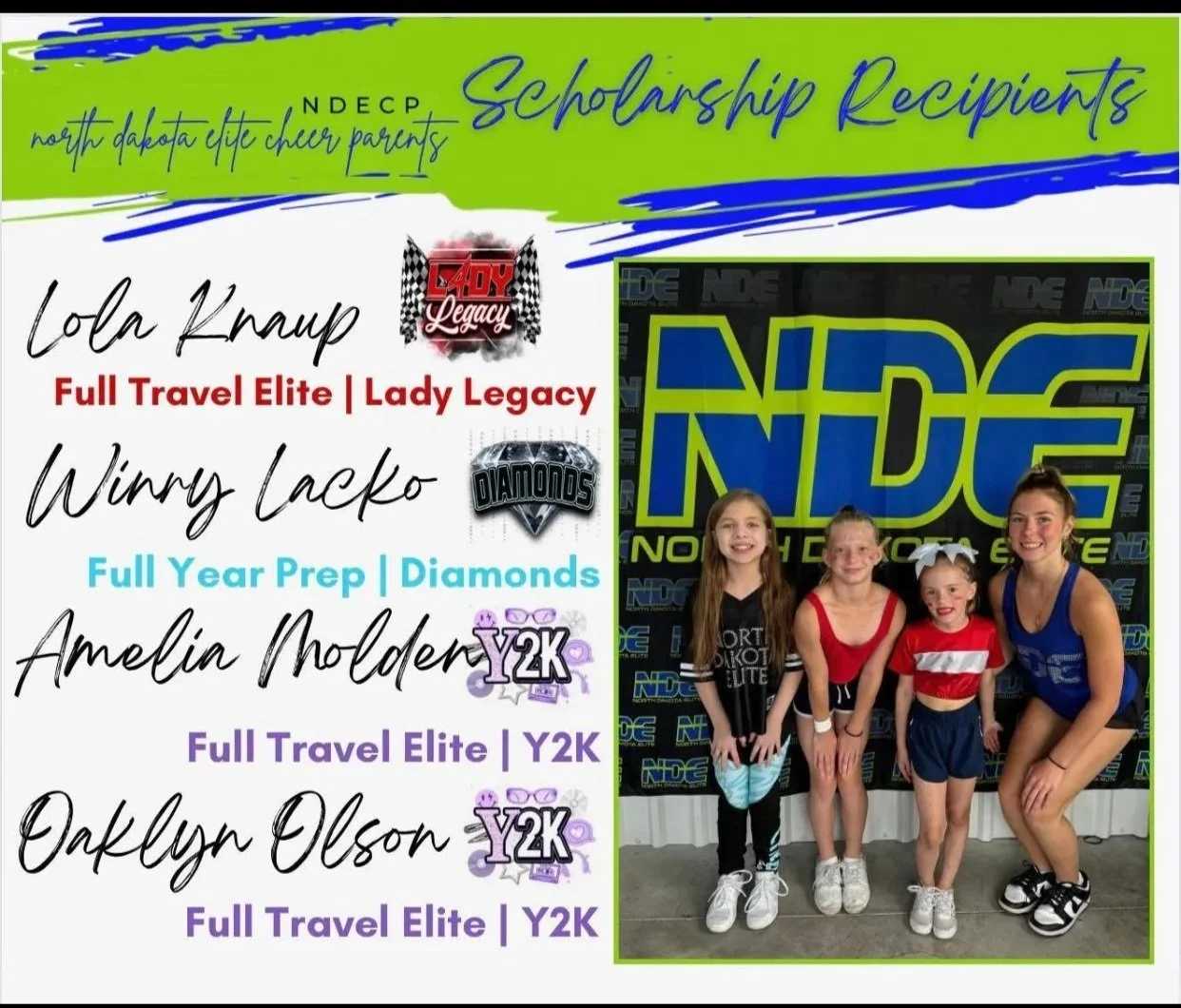 We are thrilled to recognize four exceptional athletes who have been selected by the North Dakota Elite Cheer Program (NDECP) Scholarship Committee for the 2025–2026 season!